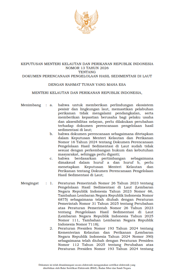 Kementerian Kelautan Dan Perikanan Telah Mengeluarkan Keputusan Menteri Kelautan dan Perikanan Republik Indonesia Nomor 13 Tahun 2026 Tentang Dokumen Perencanaan […]
